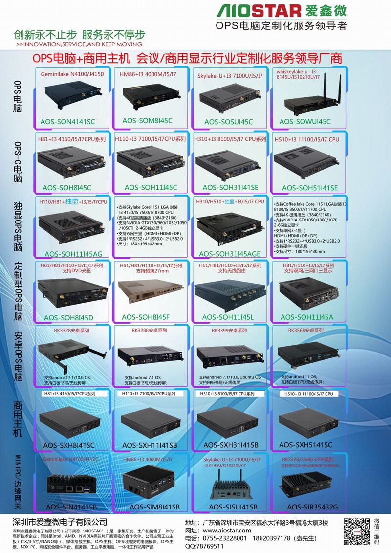深圳市愛鑫微電子有限公司(以下簡稱“AIOSTAR”)是一家集研發(fā)、生產(chǎn)和銷售于一體的高新技術(shù)企業(yè),同時是Intel、AMD、NVIDIA等芯片廠 商緊密的合作伙伴。公司主營工業(yè)主板(ITX/3.5寸/NANO等)、播放終端、MINI PC、工控機、工業(yè)計算機、商用主機、LED會議大屏一體機OPS電腦、獨顯OPS電腦、OPS主機、OPS可插拔式電腦模塊、OPS主板、BOX-PC、網(wǎng)絡(luò)安全硬 件平臺、服務(wù)器、工業(yè)平板電腦、一體化工作站等產(chǎn)品。目前,產(chǎn)品已廣 泛應(yīng)用于DS、MIDS、IWB、POS、自助查詢、零售金融、工業(yè)自動化,智能 交通,網(wǎng)絡(luò)信息安全,通訊、智能安防,云計算、石油石化、醫(yī)療、軍事 裝備等多個領(lǐng)域。公司高度重視客戶的需求和滿意度,針對不同的客戶需 求,能夠快速做出積極的響應(yīng),為其進行量身設(shè)計并提供個性化的OEM/OD M服務(wù)。