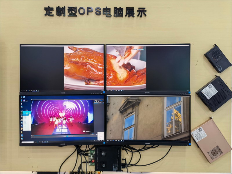 同時在展會現(xiàn)場還展示了4屏拼接或3-4屏異步顯示(HDMI+HDMI+HDMI+DP)獨顯OPS電腦方案,每個顯示通道都可以支持4K 60HZ的顯示效果。