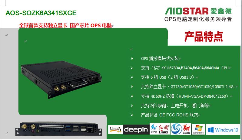 國產(chǎn)化OPS電腦:國產(chǎn)CPU飛騰FT-2000/4 /兆芯KX-6000系列CPU+國產(chǎn)操作系統(tǒng)(UOS/Deepin/Kylin)系列OPS-C電腦