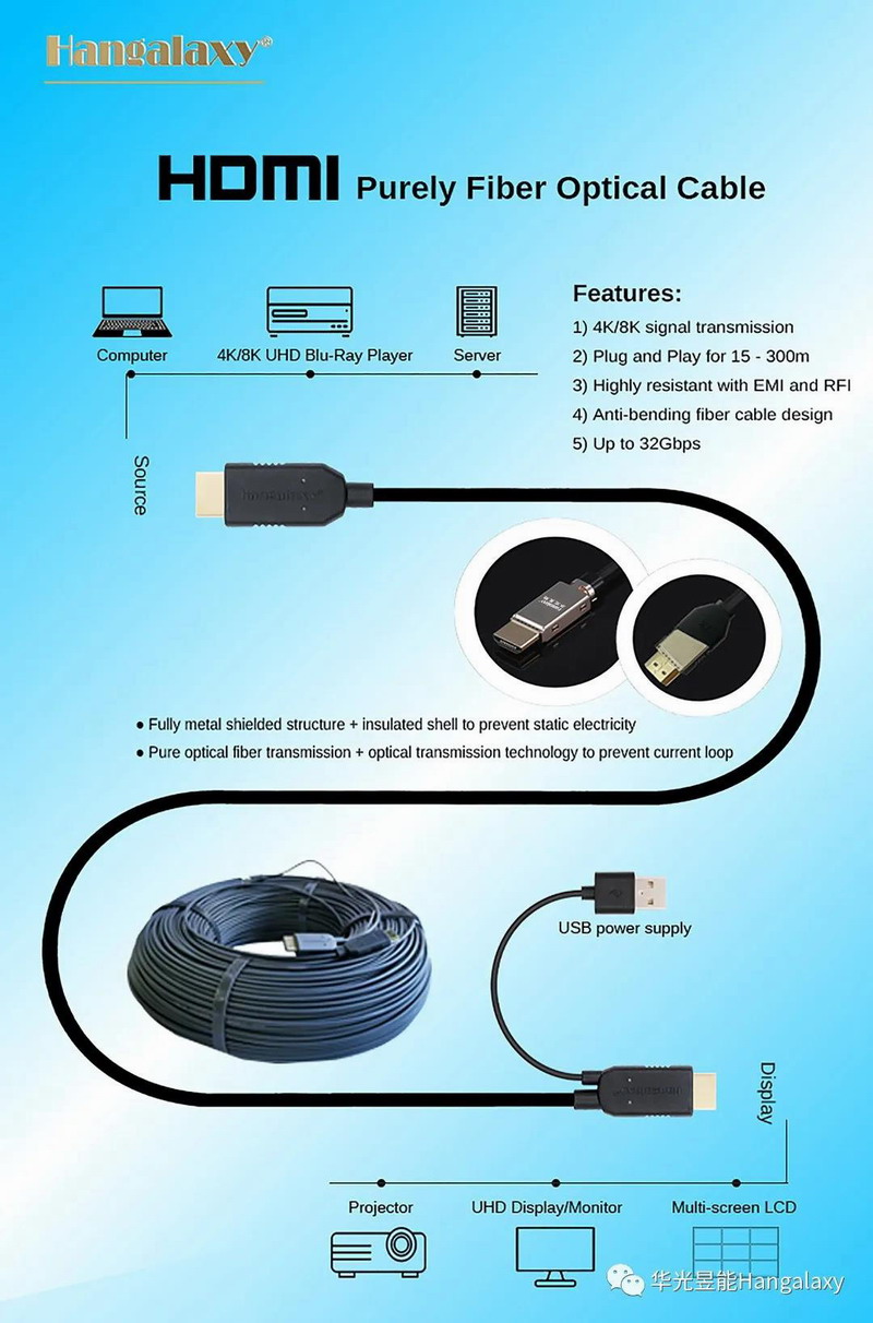 華光昱能HDMI純光一體化光纖線采用光透傳技術(shù),OM3-300多模光纖,端到端,一條線三個接口。線纜最長300米,即插即用,無需驅(qū)動程序,兼容性極佳,可以直接穿25管,也可以剪斷光纜,穿管后再熔接光纜。