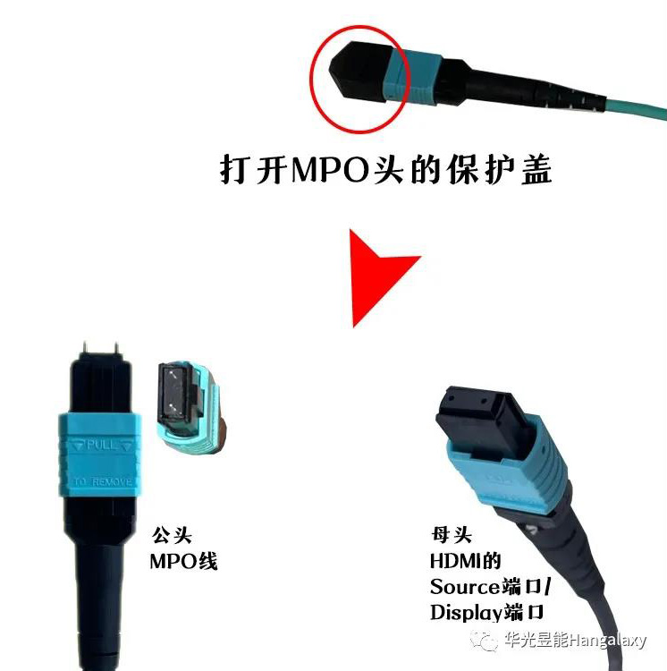 布線之后等上完主設備,再將HDMI有源光纖線的MPO接口跟MPO光纖線的接口,中間用專用的MPO適配器進行對接,卡緊。另一端也同樣對接,便能快捷完美地完成整套HDMI有源光纖傳輸鏈路的對接。