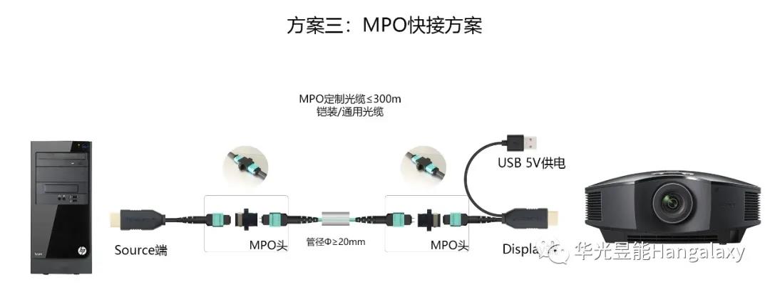 隨著關(guān)鍵零配件成本的下降,目前MPO的價格較為親民,華光昱能Hangalaxy適時推出改良版的HDMI+MPO產(chǎn)品工藝和材質(zhì)的同時,提高了MPO方案的應用,去年正式推出了HDMI/DVI/DP/USB3.0等接口的有源光纖線+MPO連接方式,讓工程布線又多了一項確實可行的解決方案。