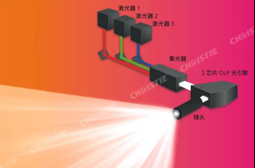 激光熒光投影使用藍(lán)色激光二極管作為基本光源,生成紅光和綠光。某些高端的投影機(jī)直接采用紅光激光,彌補(bǔ)紅光輸出的不足。這類投影機(jī)覆蓋 Rec.709 或 DCI-P3 色域,但其色彩官感仍不足以與 RGB 純激光投影媲美。