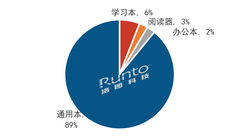 根據(jù)RUNTO線上數(shù)據(jù)顯示,2022年1-8月,在整體智能平板中,通用本占89%,學習本占比為6%,閱讀器(注:Kindlle不屬于智能平板)和辦公本占比分別達到3%和2%。