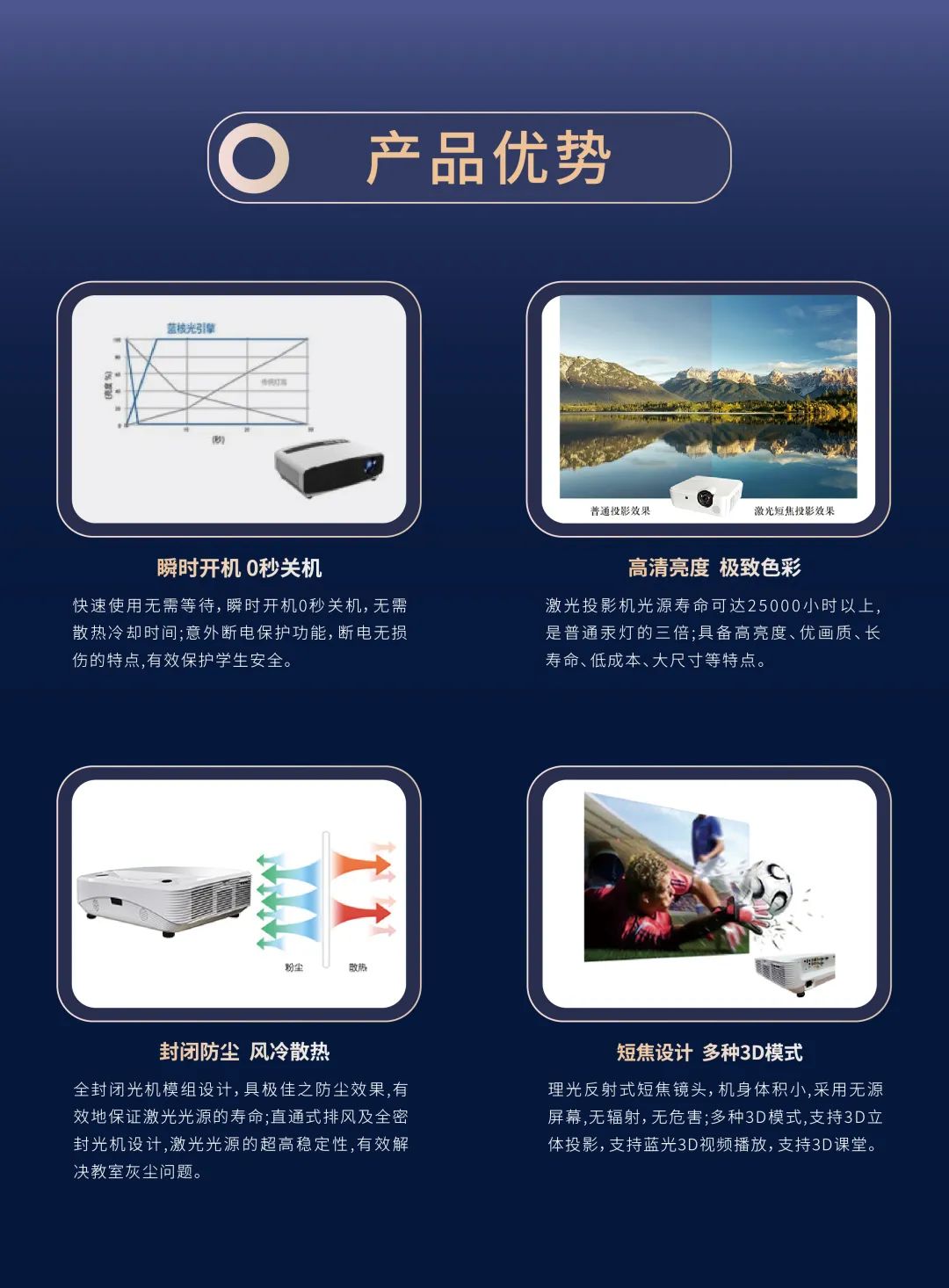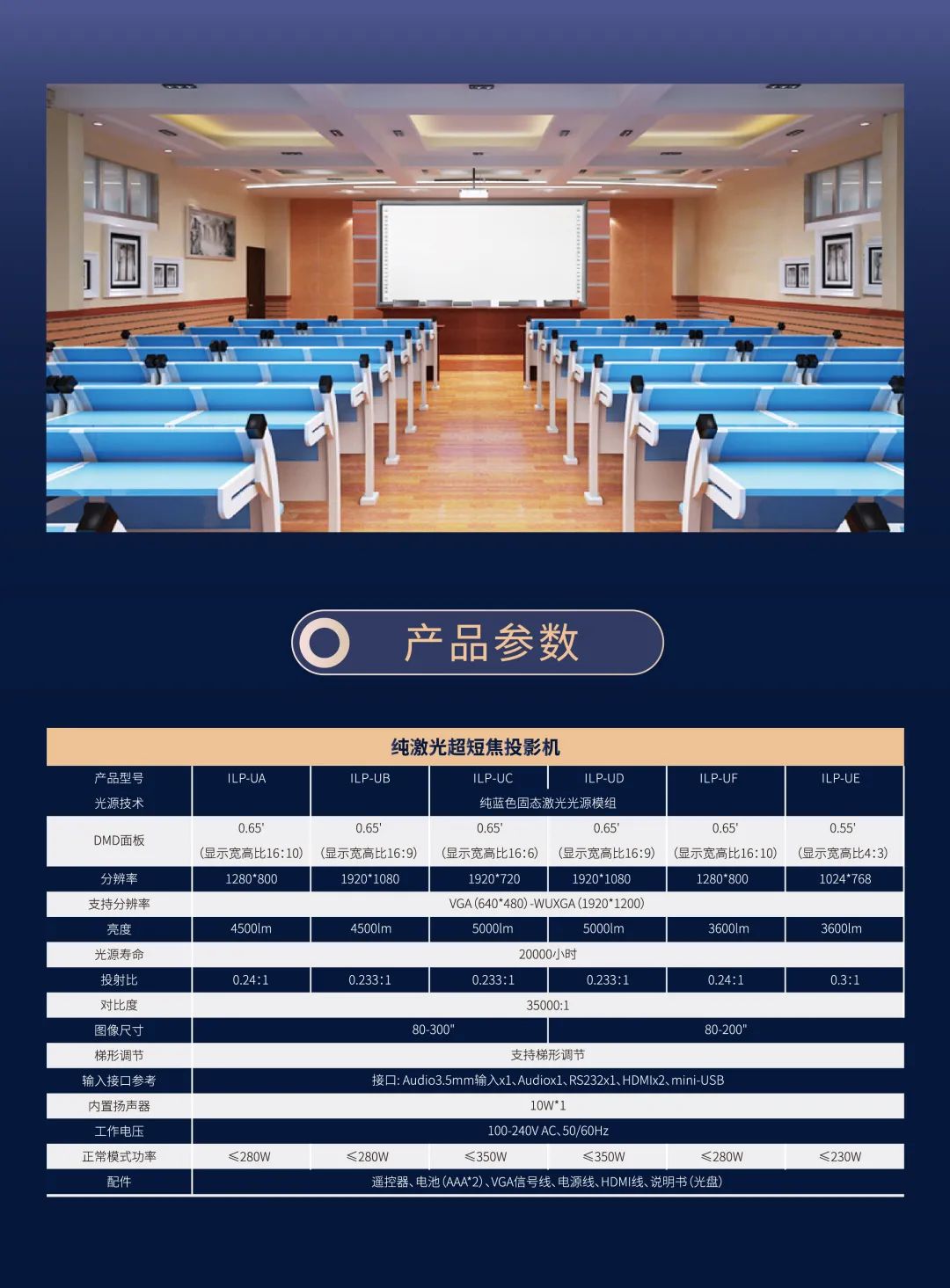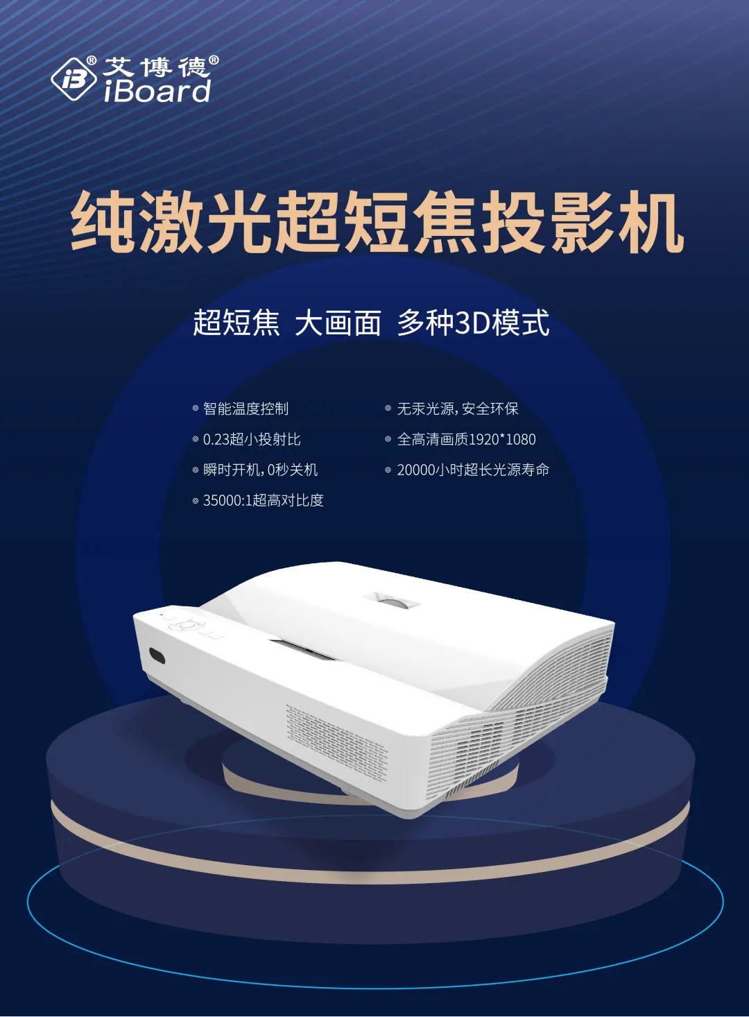 純激光超短焦投影機,采用純藍色激光固態(tài)光源模組,理光內(nèi)反射式超短焦鏡頭,打破距離限制,短距離即可投出80寸畫面;光源壽命長達20000小時,高亮度、優(yōu)畫質(zhì)、長壽命、低成本。支持梯形調(diào)節(jié),內(nèi)置10W揚聲器,清晰傳達每個訊息,艾博德智慧科技與您一起觸碰未來。