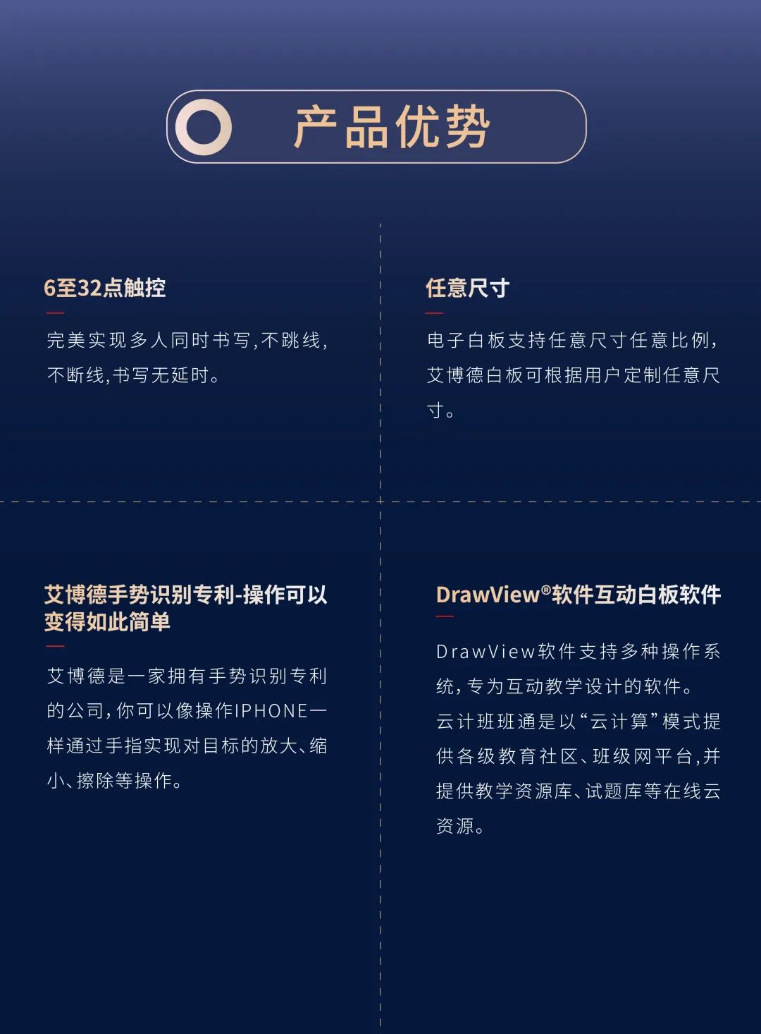 融合艾博德自主研發(fā)高速紅外觸摸屏技術(shù),產(chǎn)生強大的多點交互的觸摸功效。方便廣大教師輕松自如開展多媒體教學(xué)、豐富教學(xué)手段,拓展教學(xué)表現(xiàn)形式,完美實現(xiàn)多人同時書寫,不跳線,不斷線,書寫無延時;根據(jù)用戶需要制定任意尺寸;擁有核心專利,手勢識別科技,流暢操作屏幕內(nèi)容。DrawView軟件專為互動教學(xué)設(shè)計,以“云計算”的模式提供資源平臺,教學(xué)資源,試題資源自由使用。艾博德紅外交互式電子白板,用手指觸碰未來。