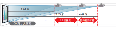 松下PT-LMZ460C系列投影機通過數(shù)碼變焦擴展功能和數(shù)碼圖像移位功能實現(xiàn)輕松調(diào)試。當(dāng)投影距離超出投影機光學(xué)變焦范圍時,可通過全新搭載的數(shù)碼變焦擴展功能擴展投影距離。如投影100寸畫面時,可由光學(xué)變焦的3.53米投影距離擴展至4.42米。使用數(shù)碼圖像移位功能時,投影圖像大小縮減至80%,同時實現(xiàn)上下、 左右±10%的位移幅度。在不移動投影機的情況下,即可將圖像移動到想要的位置。