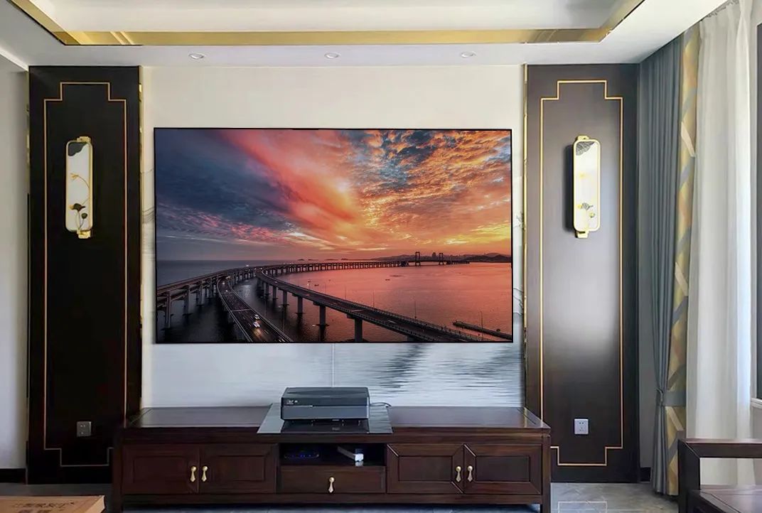 屏幕反射主機投射的光線而成像,不需要裝配繁多的光學(xué)元器件,整體重量和厚度會比同尺寸的平板電視小很多,對電視背景墻的稱重要求也就小很多,100吋、120吋的屏幕也能0縫貼墻安裝,讓客廳看起來更加大氣簡約、有設(shè)計感。
