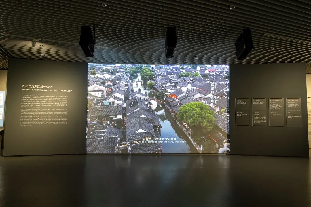三樓“創(chuàng)新之城”展區(qū)入口處播放的是長(zhǎng)江三角洲區(qū)域一體化新成果。3臺(tái)松下PT-FRZ120C工程投影機(jī)經(jīng)融合校正,呈現(xiàn)出亮度色彩高度一致的色彩,WUXGA(1920×1200)高清分辨率使得畫(huà)面層次豐富,鮮艷明晰。