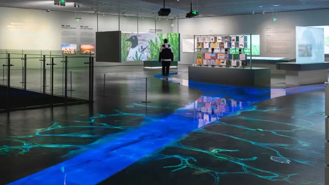 一條藍(lán)色河脈自西而東潺潺流淌,這是四樓“生態(tài)之城”的地面互動(dòng)展項(xiàng)。以流脈為主干,16臺(tái)松下PT-FRZ680C工程投影機(jī)打出的蜿蜒光影在其兩側(cè)縱貫,勾勒出河流的分支。在這里,放慢腳步,走到固定的互動(dòng)點(diǎn)位,動(dòng)作捕捉設(shè)備感應(yīng)到人體動(dòng)作,飛鳥(niǎo)就會(huì)翩然而出,悄無(wú)聲息落到隔岸。