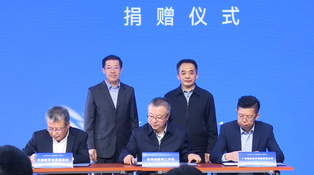儀式上,在教育部教師工作司指導(dǎo)下,廣州視睿電子科技有限公司(下文簡(jiǎn)稱(chēng)“視?萍肌保┫蛑袊(guó)教育發(fā)展基金會(huì)捐贈(zèng)教育設(shè)備及資金,打造希沃教師數(shù)字化能力提升支持項(xiàng)目(下文簡(jiǎn)稱(chēng)“項(xiàng)目”)。據(jù)悉,項(xiàng)目將在三年內(nèi)為160個(gè)國(guó)家鄉(xiāng)村振興重點(diǎn)幫扶縣教師發(fā)展中心建設(shè)智慧研訓(xùn)室,支持提升欠發(fā)達(dá)地區(qū)教師專(zhuān)業(yè)能力,以及為42所高師院校建設(shè)教育實(shí)踐智慧教室,幫助提高師范生信息素養(yǎng)和實(shí)踐能力,助力職前職后一體化。