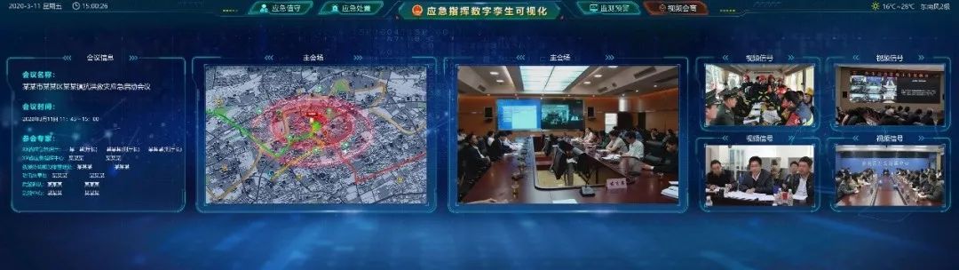 基于數(shù)字孿生城市,疊加顯示參會(huì)指揮機(jī)構(gòu)、管理部門的實(shí)時(shí)地理位置,并通過電話會(huì)議、視頻會(huì)議的方式連線各參會(huì)單位,顯示視頻會(huì)議圖像和電話通訊標(biāo)識(shí),滿足應(yīng)急會(huì)商需求,提升應(yīng)急指揮過程中的會(huì)商溝通效率,確保會(huì)商溝通順暢。