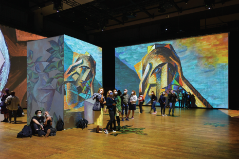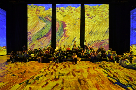 本次多媒體藝術(shù)展為捷克帶來了一個(gè)全新的理念,讓人們以不同的角度去欣賞藝術(shù)。它的特殊之處不僅在于藝術(shù)呈現(xiàn)的方式,即畫作并不是實(shí)體展示,而是以巨幅的投影形式呈現(xiàn),還在于這些畫作所覆蓋的大面積空間。這些杰作被投影到展廳四面的高墻上、場地中間的兩根立柱以及地面上。3D環(huán)繞的美妙音樂結(jié)合投影影像,讓游客們置身其間,沉浸體驗(yàn)。
