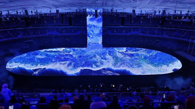 場地中央“一方水”緩緩升起,逐漸成為一塊冰,該數(shù)字裝置實(shí)現(xiàn)了技術(shù)創(chuàng)新的五面裸眼3D效果。24道激光射向冰立方,在巨大的冰立方上雕刻歷史,從往屆冬奧會(huì)到北京冬奧會(huì),在流光溢彩中,觀眾穿越著時(shí)空。
