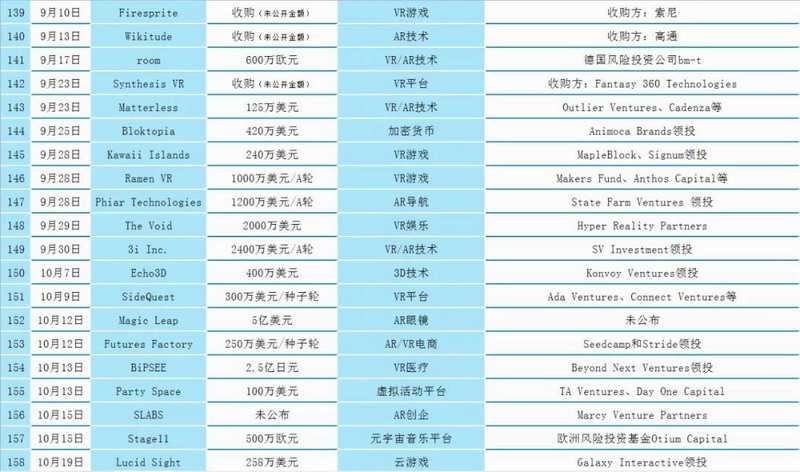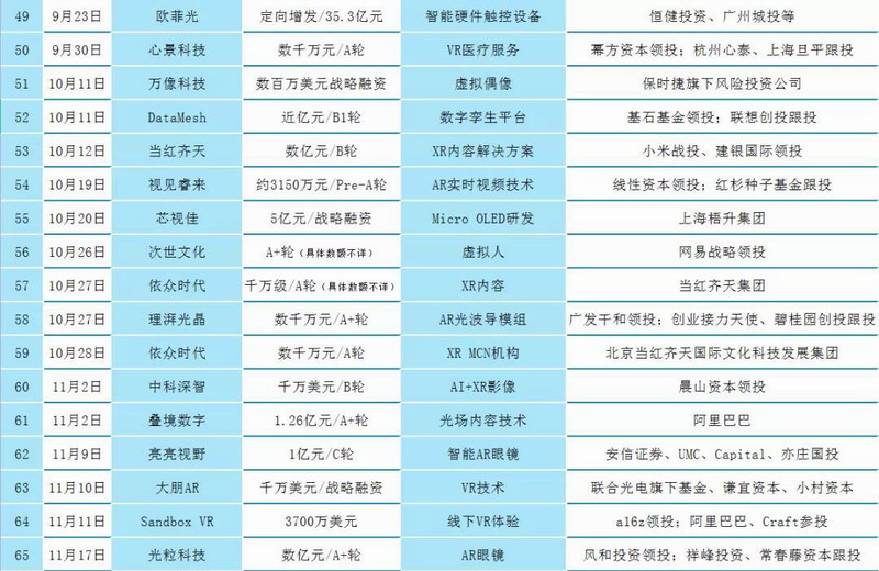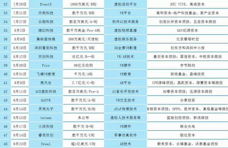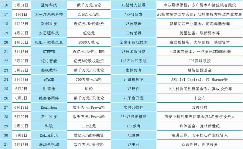 本月融資并購(gòu)多為AR技術(shù)、游戲方面。國(guó)外VR游戲、硬件方面獲得較多融資;國(guó)內(nèi)多為大額融資,如AR光學(xué)廠商鯤游光電完成近4億元人民幣B+輪融資。