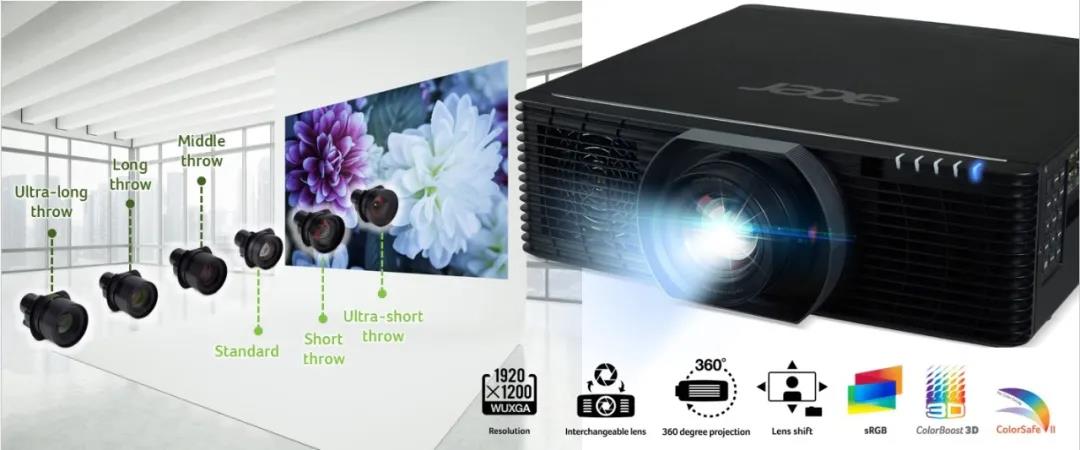 宏碁LU-P1200UT激光投影機(jī)人性化的配置靈活保障大型展館長效投影需求。LU-P1200UT采用中心鏡頭設(shè)計(jì),兼容6個(gè)可選鏡頭,鏡頭涵蓋從超短鏡頭到超長鏡頭,一鏡投天下,靈活性極強(qiáng),還支持360°投影,展館根據(jù)場地需求,可自由選擇不同鏡頭進(jìn)行安裝。節(jié)能環(huán)保也是不少展館的硬需求,LU-P1200UT采用激光光源,亮度衰減低,擁有長達(dá)20,000小時(shí)的使用壽命,每天使用8小時(shí)的情況下,10年無需換光源,在 Acer EcoProjection節(jié)能技術(shù)的加持下,LU-P1200UT能夠?qū)崿F(xiàn)7x24小時(shí)不間斷投影,保障展館長期投影工作。