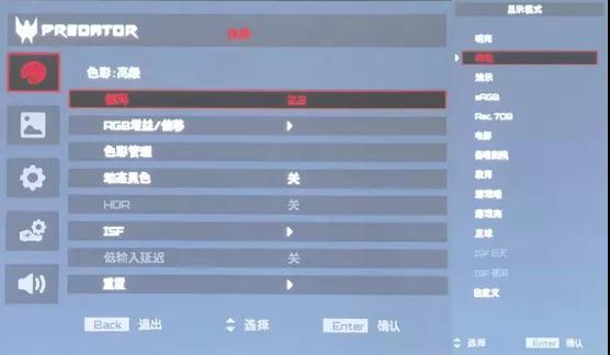 對(duì)不同游戲畫面,GM712在設(shè)置界面為玩家提供了多種預(yù)設(shè)顯示模式,特別提供了游戲畫面暗/亮情況時(shí)的顯示模式。不僅如此,玩家還可根據(jù)自己喜好細(xì)致調(diào)節(jié)畫面的伽馬值、色彩增益、色溫以及開啟動(dòng)態(tài)黑位的功能。在這方面,GM712將自身“專業(yè)性”展現(xiàn)。