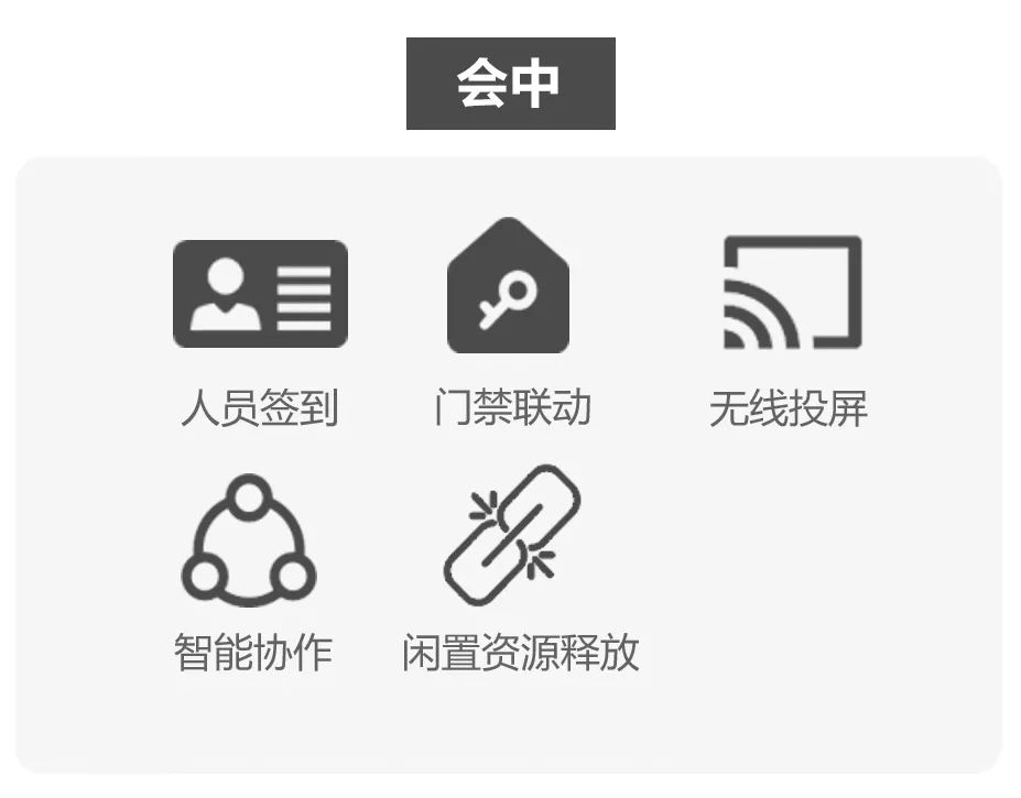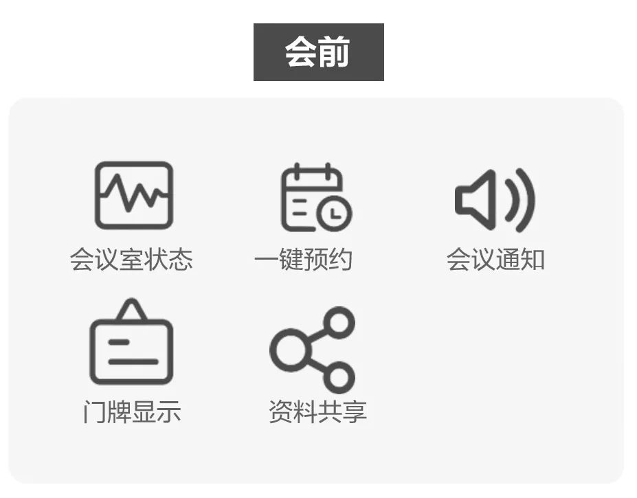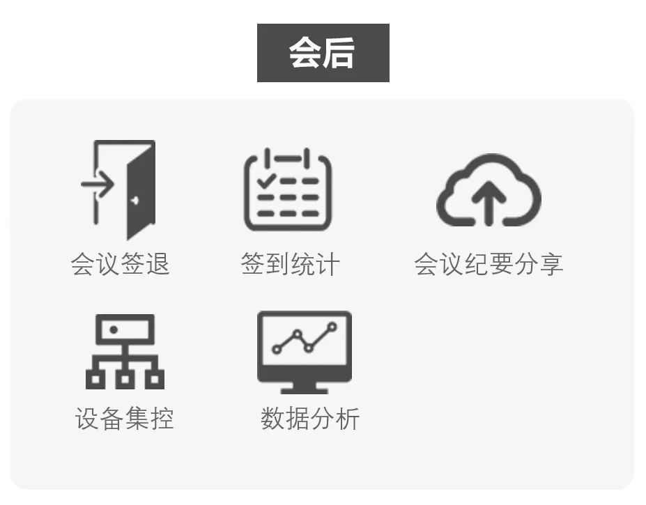 基于會(huì)前、會(huì)中、會(huì)后環(huán)節(jié),通過可視化、智能化、物聯(lián)管控等技術(shù),實(shí)現(xiàn)會(huì)議流程標(biāo)準(zhǔn)化、會(huì)議行為智能化、會(huì)議管理高效化。