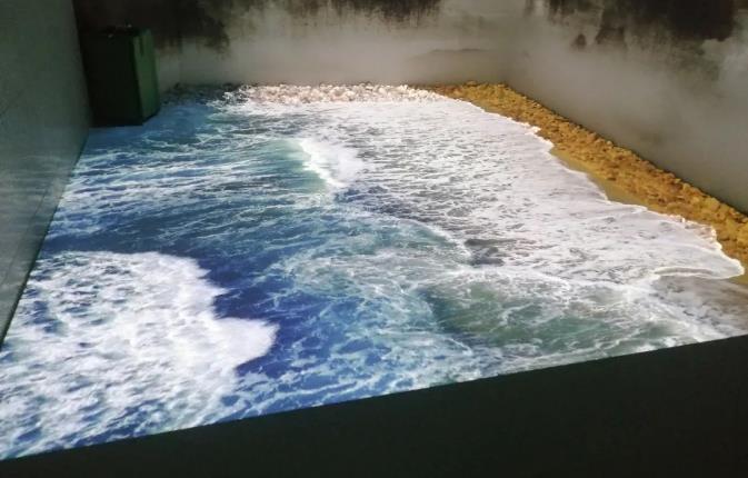 三峽的高山奇峰鎖得住強(qiáng)勁的西風(fēng),關(guān)不住沖飚絕浪一瀉千里、向東流去的長(zhǎng)江水。展廳中借由地面投影將這波瀾壯闊的長(zhǎng)江水帶到了參觀者腳下,呈現(xiàn)出木船在江面行駛的場(chǎng)景,帶領(lǐng)參觀者乘船游三峽。