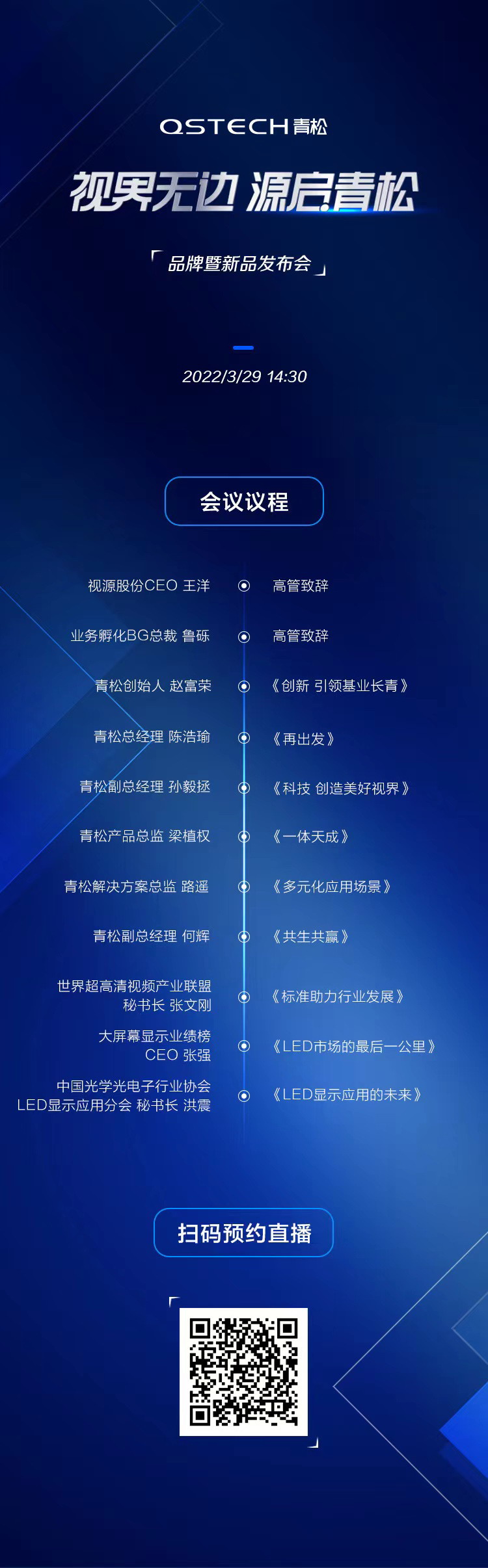 2022年3月29日,CVTE(視源股份)旗下QSTECH青松品牌“視界無邊,源啟青松”全球新品發(fā)布會(huì)即將在線上舉行。作為視源股份在LED行業(yè)戰(zhàn)略布局的領(lǐng)戰(zhàn)部隊(duì),青松光電將帶來一場(chǎng)頗具看點(diǎn)的發(fā)布活動(dòng)。QSTECH青松30周年全新品牌戰(zhàn)略將與新產(chǎn)品和新服務(wù)等一同亮相,旨在展示先鋒企業(yè)對(duì)行業(yè)發(fā)展新方向的探索,推動(dòng)商顯行業(yè)邁入高質(zhì)量發(fā)展階段。