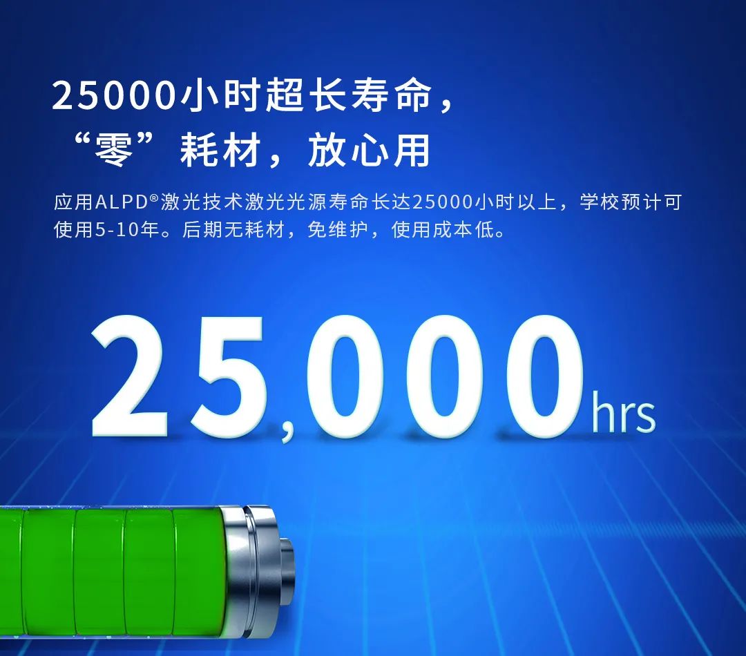 激光光源的投影機不同于燈泡投影機,不含汞等任何有害元素,屬于綠色光源。不會有炸燈危險。應(yīng)用ALPD®激光顯示技術(shù)的激光光源壽命得到顯著提升,采用光源光機一體化和光路密封雙重防塵設(shè)計,謹(jǐn)防教室中的粉塵進(jìn)入光機系統(tǒng),有效延長光學(xué)引擎的壽命。后期不需要更換光源等維護(hù),減少耗材的使用,目前光峰激光商教機平均使用壽命為25000小時。長遠(yuǎn)來看,極具性價比。