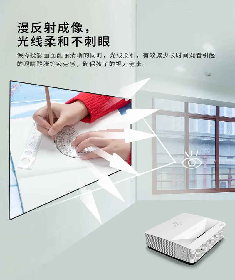 投影顯示系統(tǒng)屬于漫反射光線,每個角度的光線都能反射到人眼中,在側(cè)面觀看投影也不會有反光看不見畫面的問題。且漫反射光線柔和,人眼觀看更舒適,能有效減緩近視的加深,預(yù)防學(xué)生近視,給他們一個光明的未來。