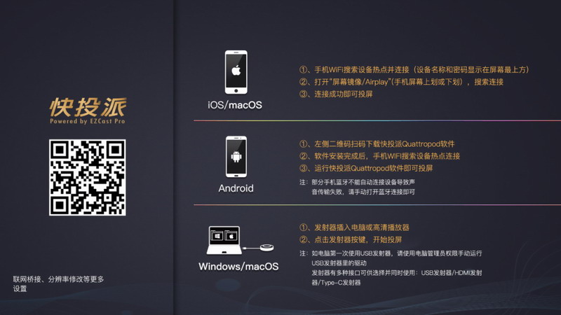 安裝完成之后便能看見無線投屏器的待機界面。待機界面簡介明了,基本的操作也在上面,感覺都不用特地去看說明書了,一眼便懂,個投屏過程中非常簡單,一次成功。