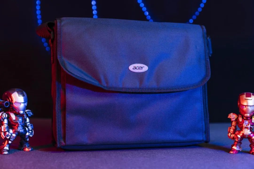 拿出投影機(jī)它的外觀設(shè)計(jì)更具辨識(shí)度,在上蓋的表面上,繪制著電競(jìng)元素濃厚的花紋,這樣一來(lái),這臺(tái)投影機(jī)就能輕松的與一般的投影機(jī)區(qū)分開(kāi)來(lái),雖說(shuō)外觀不代表其性能,但是電競(jìng)領(lǐng)域里,無(wú)論是機(jī)箱、外設(shè)還是顯示器,在其設(shè)計(jì)方面各大廠商都在發(fā)揮著自己的設(shè)計(jì)實(shí)力,作出語(yǔ)種不同且極具辨識(shí)度的外觀設(shè)計(jì),才能迎合電競(jìng)玩家的心理,這是連接玩家與產(chǎn)品好感度的一個(gè)重要因素。打開(kāi)這臺(tái)投影機(jī)首先看到的是一個(gè)手提包,這是與一般的投影機(jī)不同的地方,首先作為一臺(tái)投影機(jī)一般來(lái)說(shuō)并不需要經(jīng)常的變幻位置甚至是攜帶出門,而這臺(tái)掠奪者GM712卻給配了這么一個(gè)收納背包,說(shuō)明廠商是很懂得喜歡折騰的電競(jìng)玩家的心思的,因?yàn)檫@是一群生命不息折騰不止的人,為了能夠得到極致的體驗(yàn)再麻煩的事情都變得理所應(yīng)當(dāng),所以這個(gè)收納袋的出現(xiàn)也不算出奇冒泡了,反而會(huì)讓懂的人會(huì)心一笑。