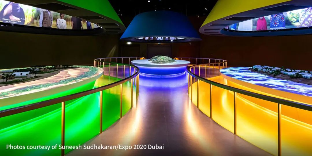 進入展館,首先是一段介紹視頻展示了展館場景和觀眾行程。隨后展館為游客提供了三條平行路徑,分別聚焦了食物、水和能源三大主題,每一個主題下面都包含著一個普通人不平凡的故事。通過他們向人們展現(xiàn)了如何在資源貧乏的地區(qū)通過創(chuàng)新思想來開發(fā)挖掘可持續(xù)發(fā)展的機遇。