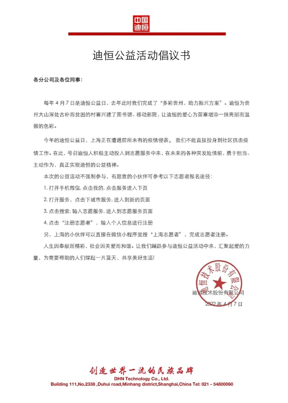 迪恒公益基金會(huì)也向員工發(fā)出呼吁:迪恒人在保證自身安全的同時(shí)多多參與到疫情防控志愿者行動(dòng)中來,并得到了迪恒人的積極支持。