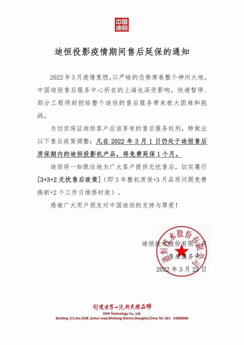 為解除新加盟迪恒還不了解迪恒服務(wù)的合作伙伴,在疫情下的一絲擔(dān)憂。2022年3月23日,中國迪恒向全國銷售系統(tǒng)發(fā)出免費(fèi)延保的通知,售后無憂,迪恒一直都在合作伙伴身后。