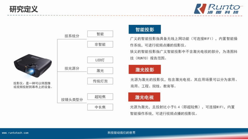 投影產品從系統方面可以分為智能和非智能兩大類;從光源可以分為激光、LED、傳統燈泡等;從技術可以分為LCD、DLP、LCOS等;從應用場景可以分為家用、商用、工程、院線、教育等。本文中的激光投影范圍包括了激光電視,且和“智能投影“品類存在重疊,重疊部分為采用激光光源,智能系統的中長焦投影儀。