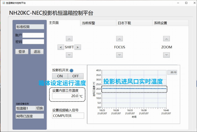 操控方面,NEC投影機(jī)定制IP65級(jí)智能戶外箱體的控制軟件與NEC投影機(jī)控制完全兼容,可通過(guò)控制軟件對(duì)箱體進(jìn)行溫度設(shè)置,并對(duì)投影機(jī)進(jìn)行開(kāi)關(guān)機(jī)、鏡頭位移、變焦、聚焦,輸入信號(hào)切換等操作;還能通過(guò)物聯(lián)網(wǎng)遠(yuǎn)程監(jiān)控系統(tǒng)實(shí)時(shí)了解箱體及投影機(jī)的運(yùn)行狀態(tài)。