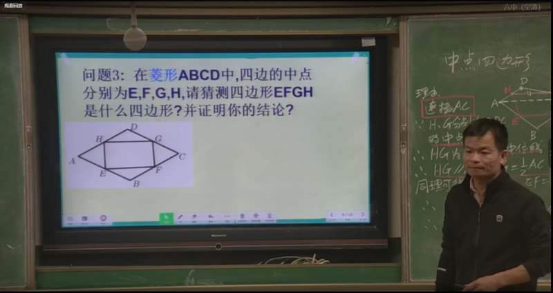 此次活動,首先由六中實(shí)驗(yàn)中學(xué)陳杰洪老師和平沙培英學(xué)校鐘利老師執(zhí)教《中點(diǎn)四邊形探究》。兩位老師分別在自己的學(xué)校完成了課程講解,全區(qū)教師線上參與了聽課評課,精彩的課程表現(xiàn)獲得了老師們的一致點(diǎn)贊。