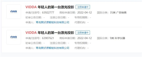 根據(jù)海信視像此前發(fā)布的公告,近期將會(huì)推出“行業(yè)首款純?nèi)す飧咂焚|(zhì)4K智能投影”,并且強(qiáng)調(diào)會(huì)主打年輕群體。而在上周,又有媒體記者從國(guó)家商標(biāo)網(wǎng)站發(fā)現(xiàn)Vidda已注冊(cè)了包含“年輕人的第一臺(tái)激光投影”等多個(gè)激光相關(guān)的商標(biāo)。