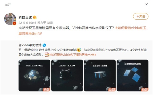 據(jù)了解,海信旗下年輕潮牌Vidda在五一假期聯(lián)合國(guó)星宇航推出了一款聯(lián)名數(shù)字藏品,總共發(fā)行10000份,每份售價(jià)29.9元。4月30日20:00上線后,僅12分鐘即被網(wǎng)友搶購(gòu)一空。而從Vidda官微放出的動(dòng)畫來(lái)看,這組數(shù)字藏品包含一個(gè)完整版的衛(wèi)星和三個(gè)零件。完整版衛(wèi)星在虛擬的宇宙中運(yùn)行,并且能在太空中投出有卡塔爾世界杯授權(quán)的圖像,讓這顆衛(wèi)星像極了一個(gè)太空中的投影機(jī)。而其中一個(gè)激光器零件,更是被網(wǎng)友認(rèn)為是做實(shí)了Vidda即將推出激光投影產(chǎn)品。