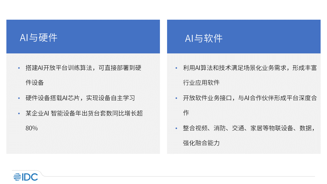 人工智能技術(shù)融合,賦能軟硬件升級(jí)。企業(yè)強(qiáng)化AI算法、AI芯片對(duì)既有產(chǎn)品和服務(wù)(如:采集、存儲(chǔ)、分析、解決方案等)的能力提升。在硬件方面,廠商通過搭建人工智能開放平臺(tái),可直接部署到硬件產(chǎn)品,實(shí)現(xiàn)“算法定義攝像機(jī)”。其中,大華股份AI 智能設(shè)備年出貨臺(tái)套數(shù)同比增長超 80%。在軟件方面,人工智能技術(shù)針對(duì)行業(yè)場景賦能軟件平臺(tái),通用、行業(yè)算法以及數(shù)據(jù)模型,形成軟件開放融合生態(tài)。