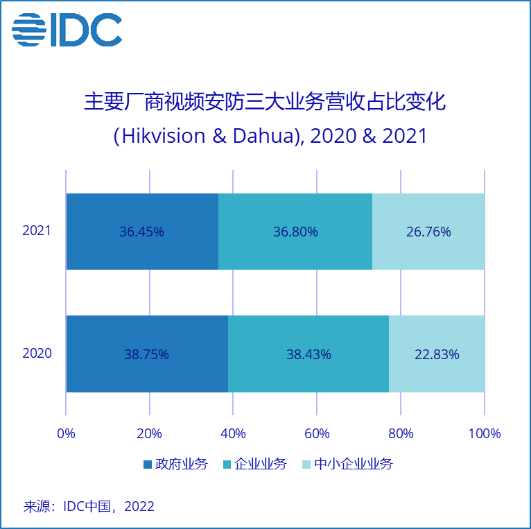 中小企業(yè)業(yè)務(wù)營收增長快速。一方面,視頻物聯(lián)應(yīng)用向下沉市場發(fā)展;另一方面,營銷渠道商擔(dān)心受到芯片供應(yīng)的影響,在2021年下半年存在囤貨行為。企業(yè)業(yè)務(wù)營收與政府業(yè)務(wù)相當(dāng),未來將進(jìn)一步趕超。當(dāng)前,視頻安防企業(yè)在企業(yè)服務(wù)行業(yè)深化布局,廣泛在制造、建筑、教育、電力、石化、煤炭、鋼鐵、金融、醫(yī)療、物流、文旅、農(nóng)產(chǎn)、零售等領(lǐng)域開展行業(yè)應(yīng)用。