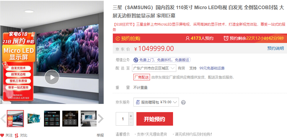近日,三星110英寸Micro-LED電視The Wall正式在三星商用電器京東自營旗艦店上架并開啟預(yù)約,售價高達1049999元。