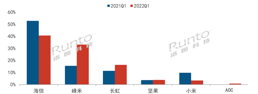 2022年第一季度,中國激光電視市場高寡占型格局愈加明顯。根據(jù)洛圖科技(RUNTO)數(shù)據(jù)顯示,海信、峰米、長虹TOP3品牌合計份額高達(dá)90%,較去年同期增長了11個百分點。