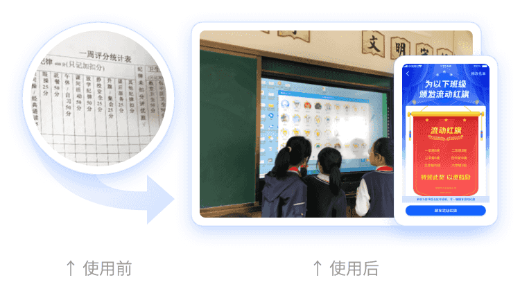 學(xué)校通過班優(yōu)APP、一體機(jī)等設(shè)備高效點(diǎn)評(píng)。除了老師,學(xué)生也可以參與到自習(xí)管理、衛(wèi)生值日、作業(yè)管理的點(diǎn)評(píng)中去,增強(qiáng)了學(xué)生的參與感和集體榮譽(yù)感,促進(jìn)班級(jí)建設(shè)。