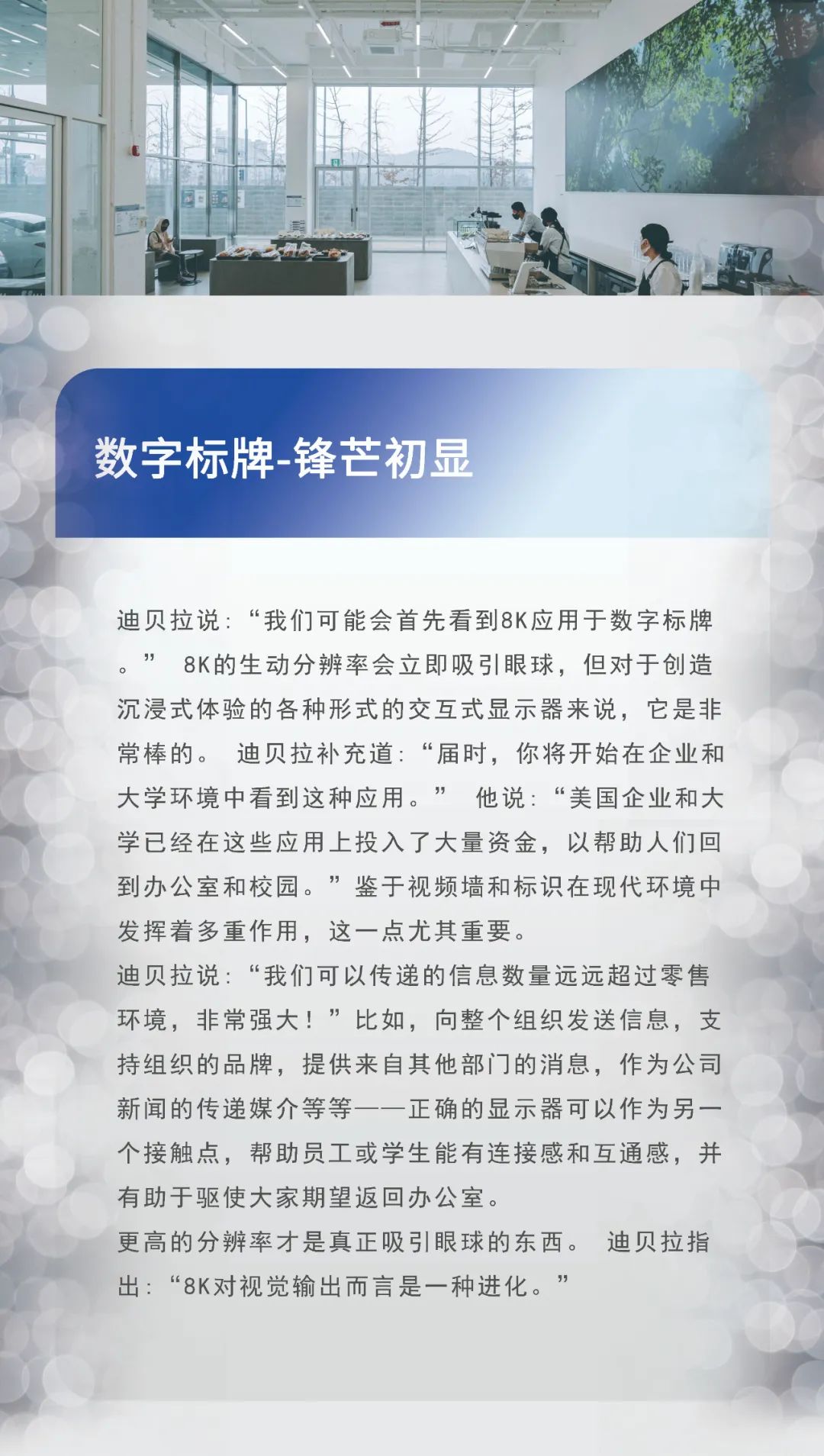 快思聰商業(yè)產(chǎn)品營銷總監(jiān)邁克爾·迪貝拉(MichaelDibella)表示:“我們將展示一個零售標牌應(yīng)用程序,這是一個基于軟件的8K流解決方案,將內(nèi)容推送到四個大型顯示器上!。這是對快思聰為稍后發(fā)布所做準備的早期觀察,也是對該技術(shù)發(fā)展方向前沿的展示。