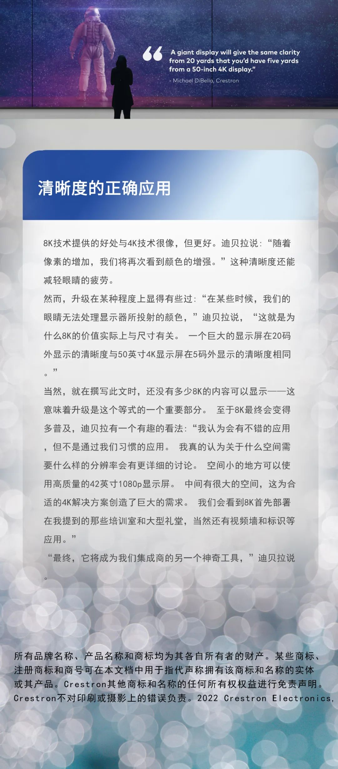 Crestron快思聰作為老牌參展商此次將攜眾多新產(chǎn)品和技術(shù)應(yīng)用亮相,其中備受關(guān)注的是8K超清視頻顯示技術(shù)。