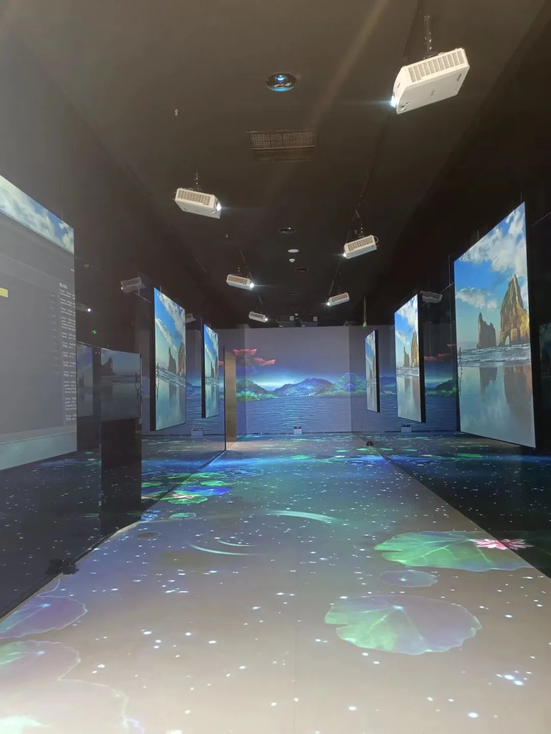 以“一條河,一座城”為敘事起點(diǎn),追溯龍華因水而生、因水而興的城市肌底,利用麗訊9臺(tái)7000流明和6臺(tái)6500流明高清投影機(jī)打造一步一景的沉浸式數(shù)字山水走廊。