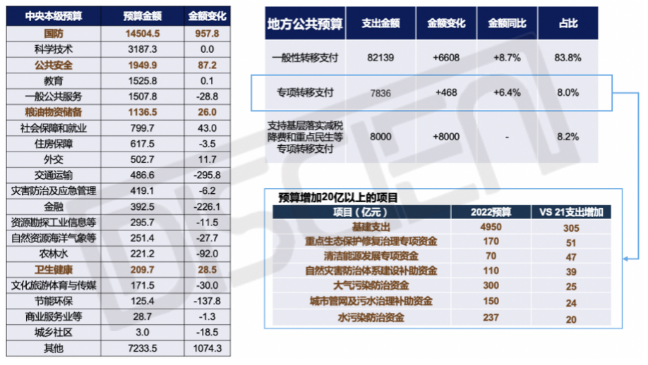 公共預(yù)算支出主要包含中央本級(jí)預(yù)算及中央對(duì)地方預(yù)算,2022年公共預(yù)算支出合計(jì)金額將達(dá)134045億元,同比增長14.3%,其中地方公共預(yù)算占比73%,同比增長18%,預(yù)算增速明顯高于中央本級(jí)。此外公共預(yù)算中對(duì)于商顯拉動(dòng)力較強(qiáng)的部分當(dāng)屬基建支出,從2022年基建總支出預(yù)算看,將達(dá)6400億元,同比增長4.8%,增速低于整體公共預(yù)算支出,其中地方基建支出增速明顯高于中央本級(jí),本文將探尋2022年公共預(yù)算支出和基建預(yù)算支出下的潛力行業(yè)機(jī)會(huì)點(diǎn)。