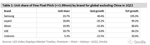 據(jù)Omdia報(bào)道,2022年第一季度,全球LED顯示屏市場(chǎng)出貨量環(huán)比下降22.3%,但最終同比增長(zhǎng)11.4%。