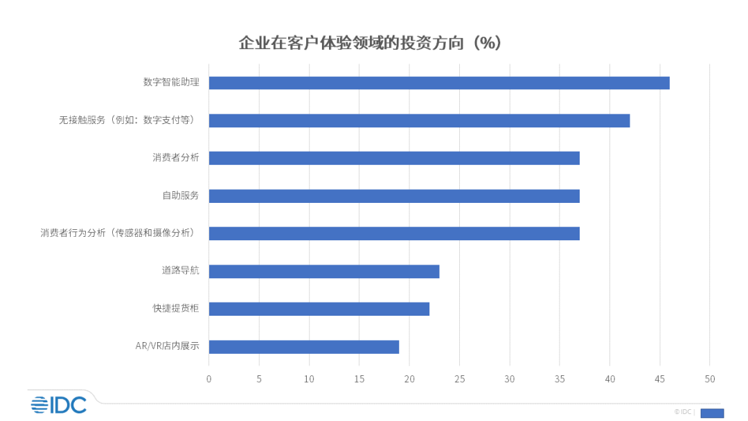 客戶滿意度和推薦度(NPS)是全球組織正在使用的企業(yè)發(fā)展和成功的重要衡量指標(biāo),目前品牌的滿意度和推薦度在很大程度上是由數(shù)字投資驅(qū)動(dòng)的。媒體、通信、交通、零售和公用事業(yè)部門正在投資打造面向客戶的數(shù)字空間,其中數(shù)字助理(45.5%)和非接觸式數(shù)字體驗(yàn)包括數(shù)字支付(42.8%)是重中之重。沉浸式體驗(yàn)作為數(shù)字世界的革新,無(wú)疑會(huì)成為企業(yè)營(yíng)銷,尤其是客戶參與的必要的數(shù)字化應(yīng)用。