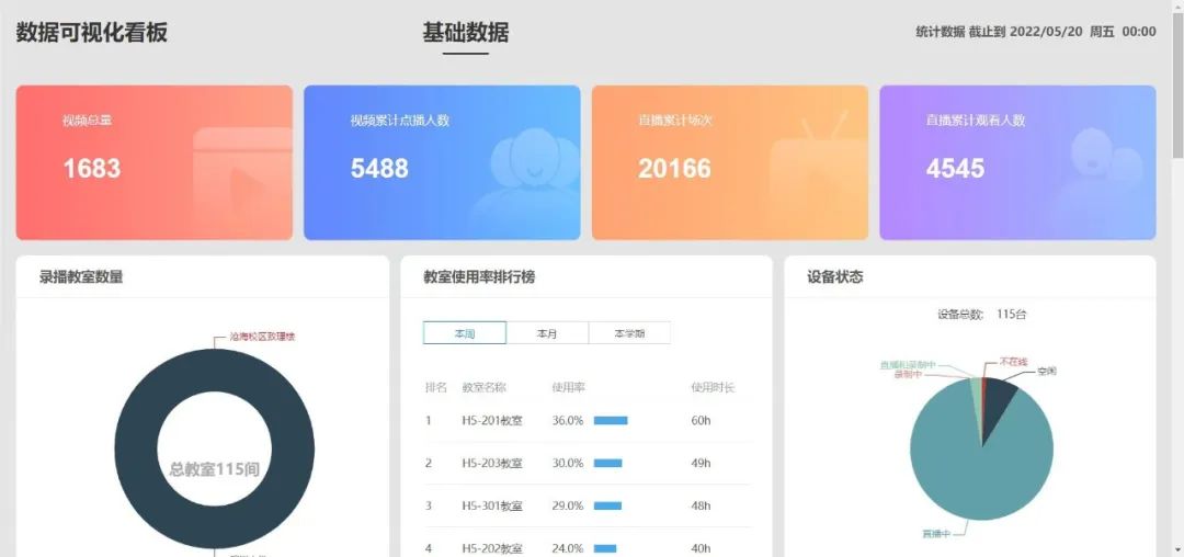 與此同時,錄播系統(tǒng)支持對接學校云平臺,學生線上考勤及學習進度情況智能量化為數(shù)據(jù)圖表,簡單明了的呈現(xiàn)于老師面前,老師及教務部門輕松掌握學生線上學習情況,高效、穩(wěn)定及高質量的線上線下教學更簡單了!