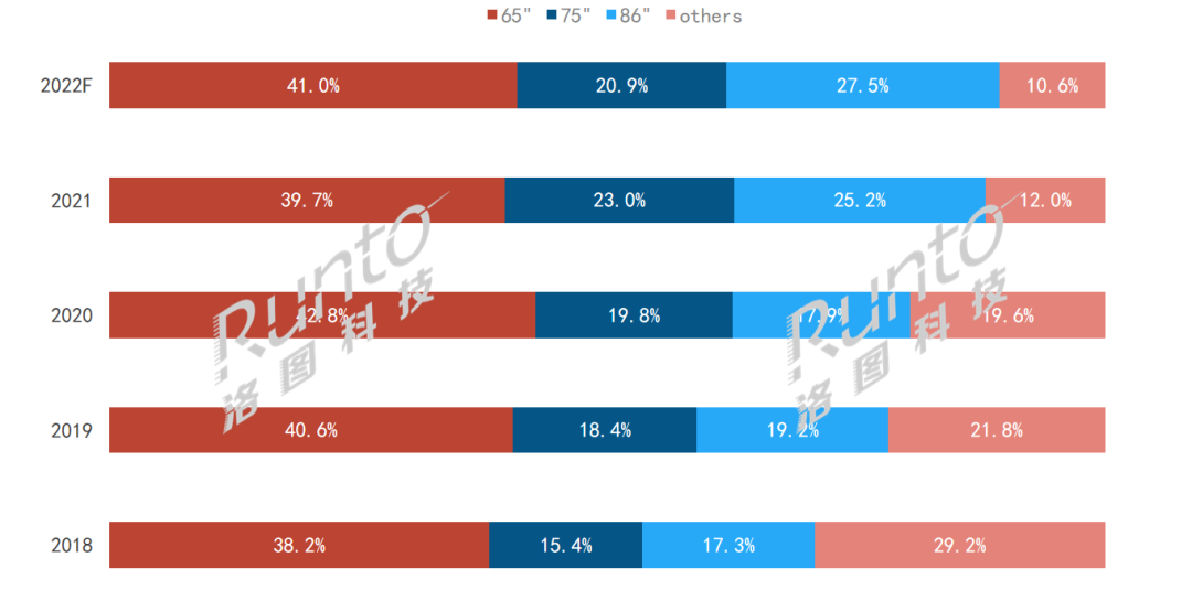 在傳統(tǒng)的企業(yè)會議場景下,商用交互平板多以大尺寸為主。根據(jù)洛圖科技(RUNTO)數(shù)據(jù)顯示,2021年65寸交互平板銷量占比39.7%,75寸占比23.0%,86寸占比25.2%。其中,65寸幾乎常年占據(jù)4成份額,86寸滲透率則在逐年爬升。
