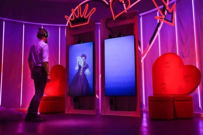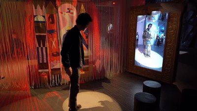 而在安徒生童話故事的講述中,“國王的新衣”區(qū)域采用背靠背的安裝了兩個(gè)顯示屏,當(dāng)游客踏入這個(gè)裝置內(nèi),便會被Kinect 攝像頭捕捉動態(tài)并在屏幕內(nèi)投放游客穿上新衣的模樣,然而另一面屏幕的游客卻看不見這些華服。